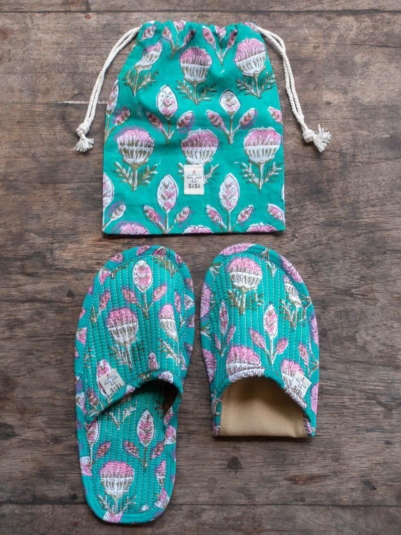 【ご予約商品:お届けは11月28日(金)前後の予定です】インドコットン・ブロックプリント「折りたたみスリッパ(大きめサイズ)+巾着セット」