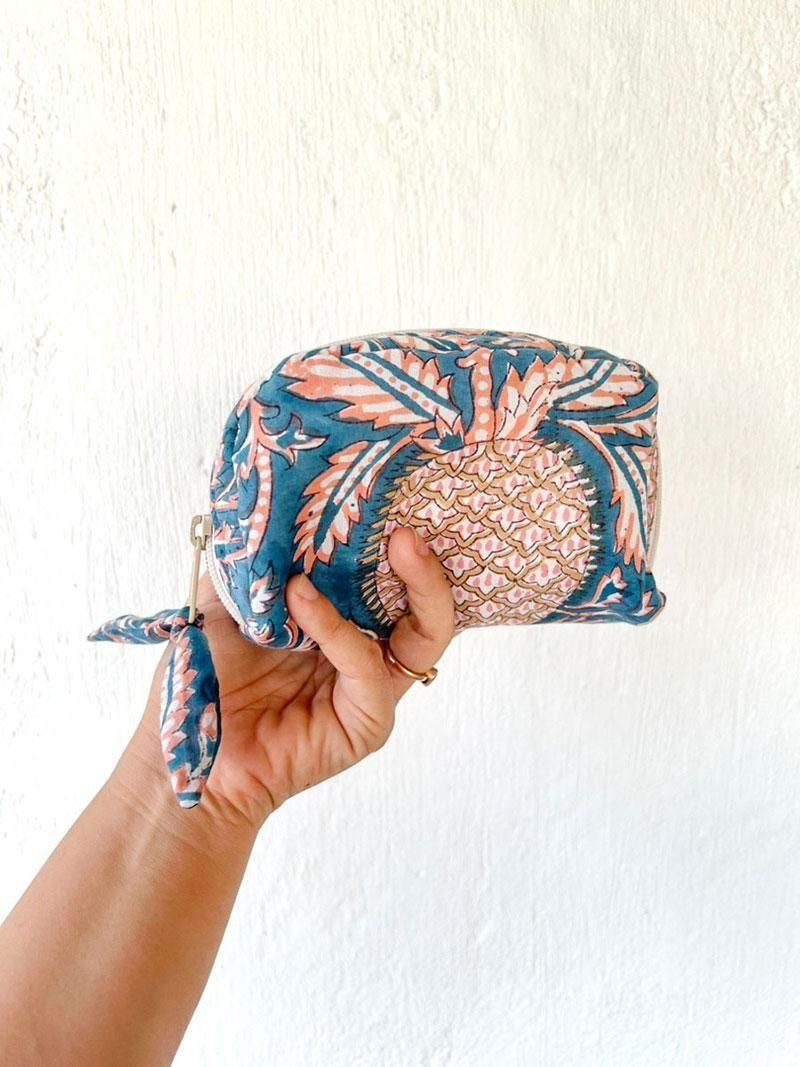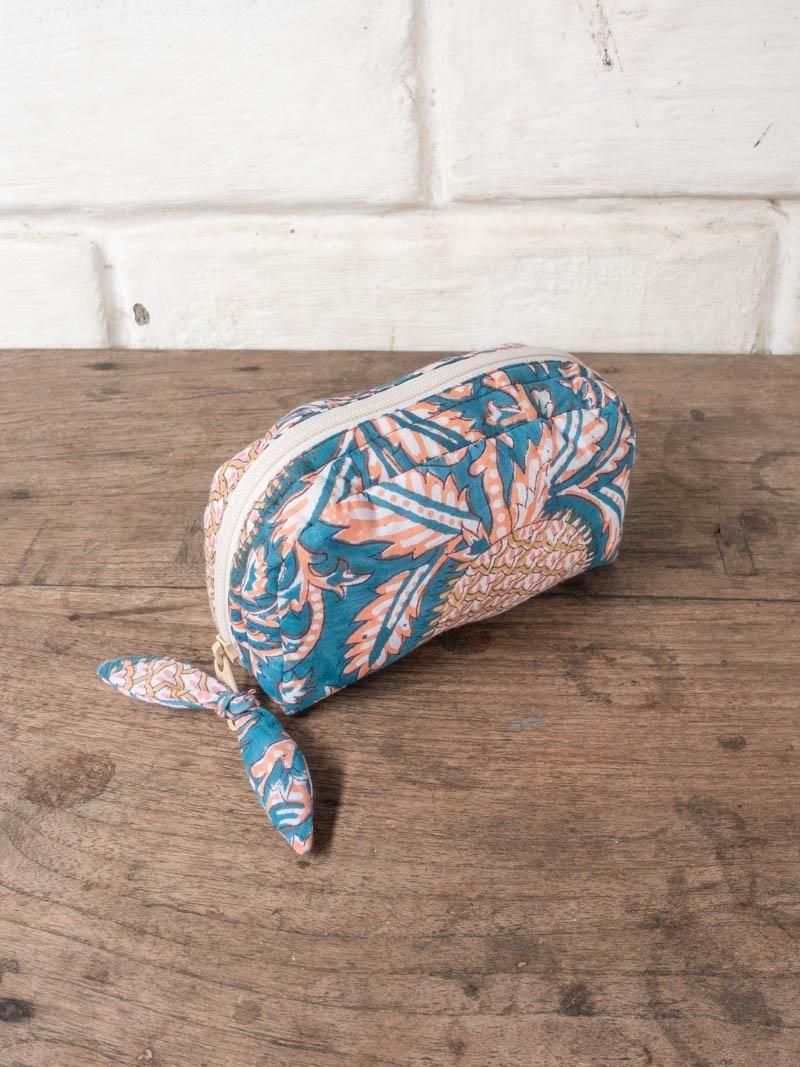 インド・ジャイプール郊外の工房で作られるブロックプリント(木製スタンプで1色ずつ色づけしていく染色方法)を使ったポーチ。滲んだ様な柄が特徴です。